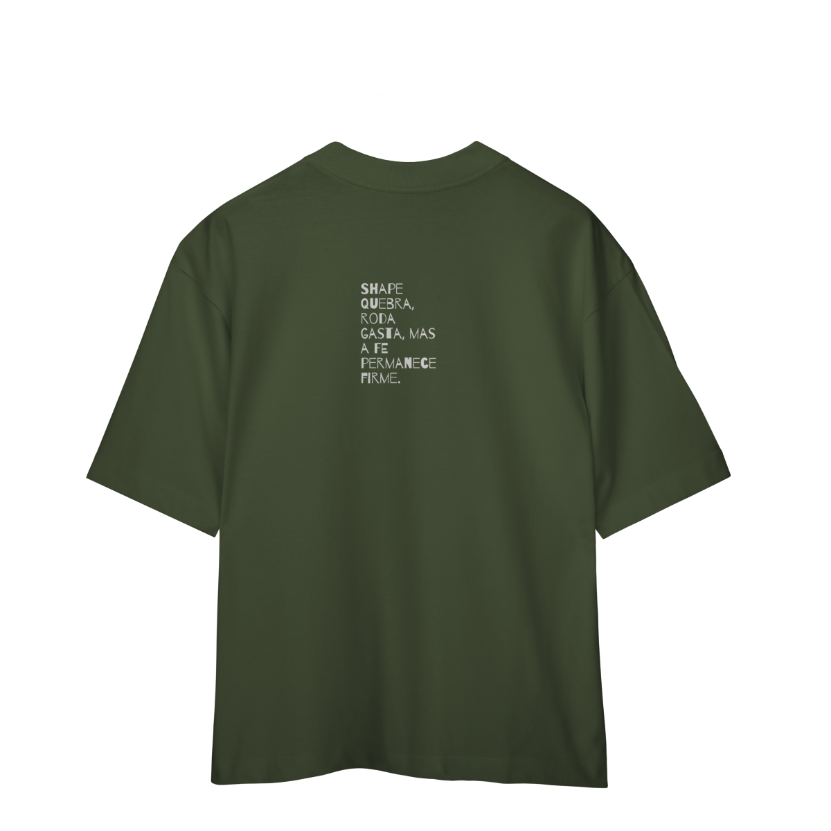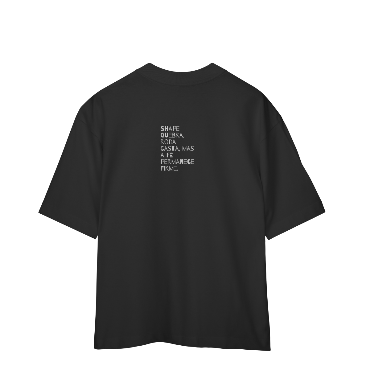 Com o lettering marcante “Shape quebra, roda gasta, mas a fé permanece firme.”, essa oversize une estilo urbano, identidade skatista e propósito eterno.
