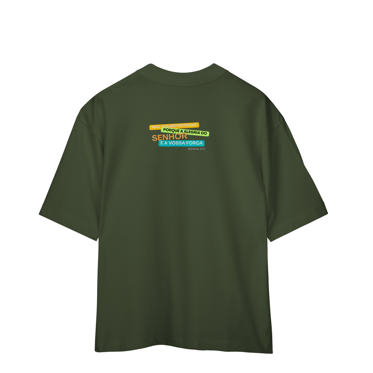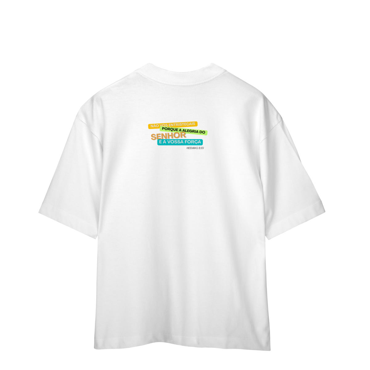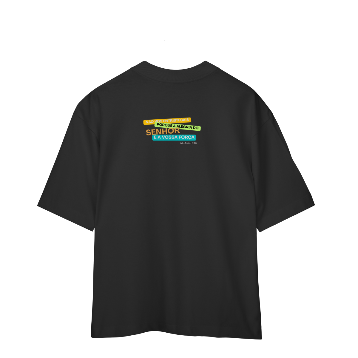 Com o lettering marcante “Sorria, Jesus te ama” e o versículo de Neemias 8:10, essa oversize combina estilo streetwear, mensagem positiva e propósito eterno.